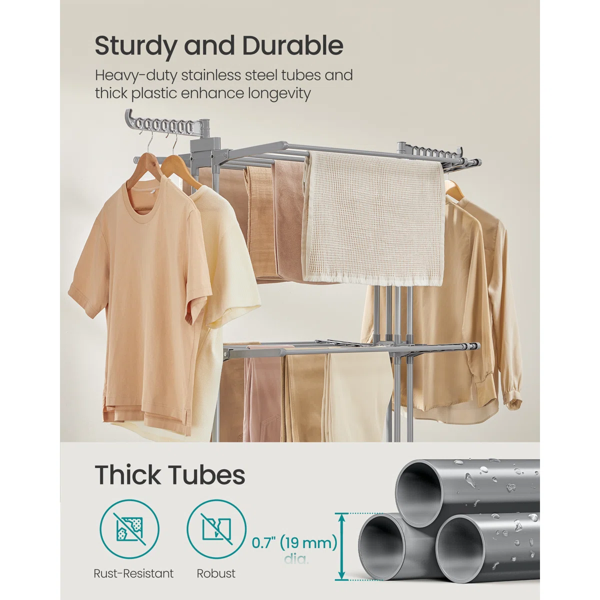 【Flexible Telescopic Design for Maximum Efficiency】 Standing 69.9 inches tall, the unique horizontal extendable rods allow you to customize your drying area based on your laundry load. From large bed sheets to delicate garments, it ensures optimal airflow and maximizes space in modern European apartments or balconies.